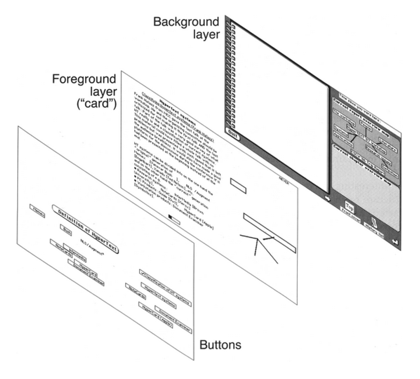 对于网页,有三层结构。每个网页上都有的公共部分叫做背景层;一个前景层:拥有与每个单独的卡片有关的元素;还有一个逻辑控制层,带有各种各样的按钮等元素。如果你不明白这个概念,你就不能使用这个东西。几乎没有人能明白这个概念除了一个图形设计师,Kristee Kreitman,画了一个分层的图片展示了这三层。当我们测试的时候,每个人立即明白了他。他的发明者用了20页的文字说明它,没有任何效果。一个图片完全搞定。