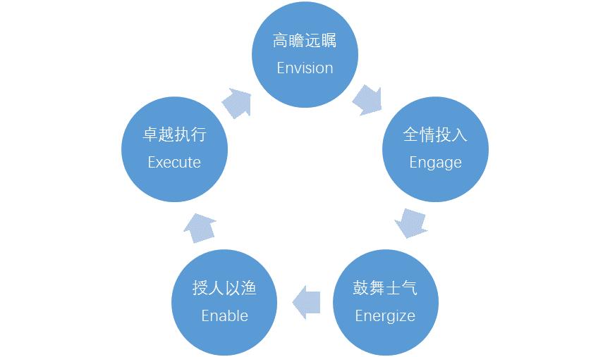 宝洁公司认为领导力的要件可以概括为5个E,它们是Envision(高瞻远瞩)、Engage(全情投入)、Energize(鼓舞士气)、Enable(授人以渔)、Execute(卓越执行)。